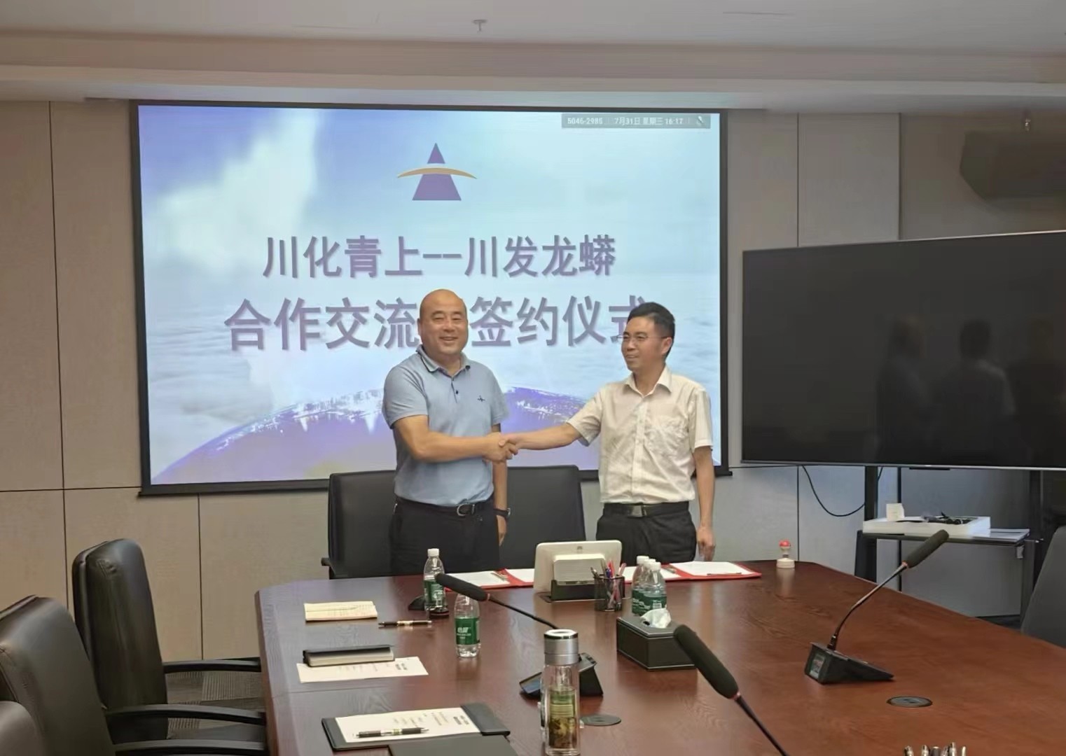 7月31日下午,四川川化青上化工有限公司(以下简称“川化青上公司”)党支部书记、董事长、总经理赵涛带队前往四川发展龙蟒股份有限公司(以下简称“川发龙蟒公司”)进行合作交流,并签署《战略合作协议》,旨在发挥双方的技术优势、品牌优势和产品优势,提高共同抵御市场风险的能力,开创发展共赢新局面。