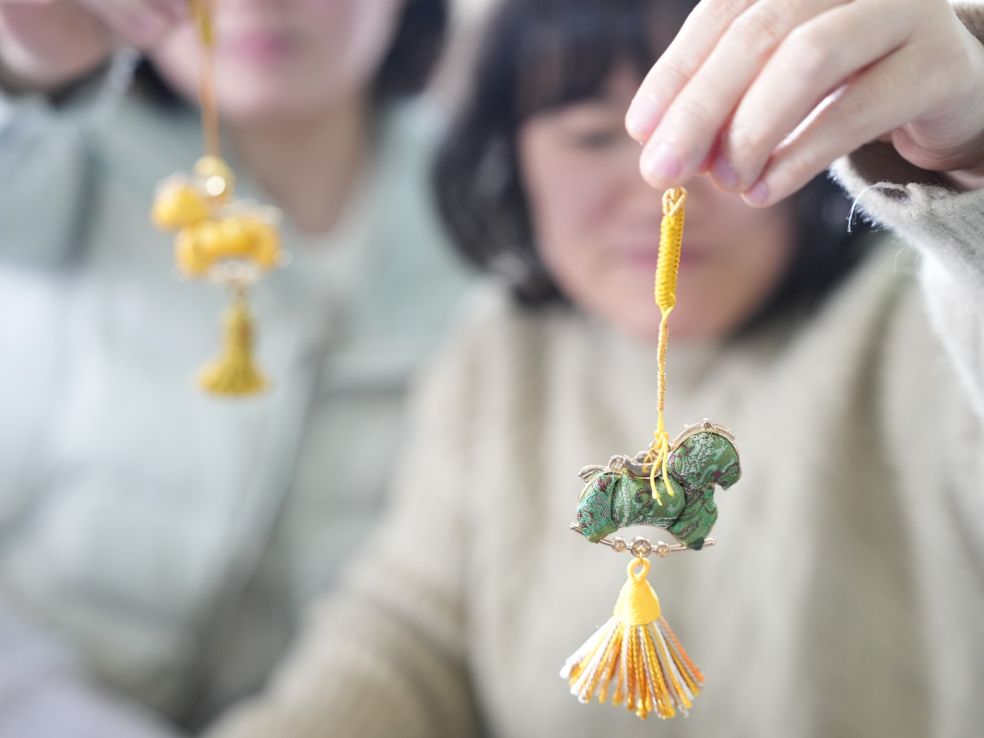 本次活动特邀非遗手作老师从宋锦历史、织造技艺、吉祥纹样寓意,到小马挂件裁剪、塑形、缝合、配饰搭配,进行了全流程讲解与指导。